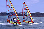 Lars Kleppich wins the title! Lars Kleppich of Australia didn't let up on Saturday 19, last day of the 1999 Mondial AOM. He won the title by claiming the last race, while Barbara Kendall of New Zealand, by now certain of keeping her title, did not compete. Its in the idyllic setting of Noumea's Côte Blanche that the 1999 Olympic sailboard World Championship came to a close. This '99 Mondial AOM brought together 156 competitors from 43 nations, and was a qualifying event for the Sydney 2000 Olympics. At the end of 11 races, Lars Kleppich of Australia claimed the men's World Champion title. Kleppich had been leading the overall score since Thursday. Once again, the Australian impressed everyone by strolling to an easy victory in the last race. He outsailed the 5 French competitors, and Tony Philp of Fiji, his most serious opponent for the title, simply could not catch up. Says Philp: "I did everything I could, but Lars was just too strong. Anyway, I am very happy to have the silver medal!". An all-new mens'podium Hard on the heels of his victory at the Sydney pre-Olympic week, Lars Kleppich won his first world title with panache. Lars was particularly impressive during the last day of the Mondial and one can easily understand his exuberance as he jumped on the beach after winning the last race: "I'm really thrilled to have become World Champion here, but I owe this victory to my coach Brendan Todd, the man who represented Australia at the Atlanta Olympics". Adds Kleppich: "It's been a beautiful Mondial, and I am delighted to have completed it like this, particularly as I am now practically assured of going to the Sydney 2000 Olympics". No doubt, sailing in his own waters, Lars will be a formidable contender for the Olympic gold. The podium of the Mondial AOM featured an all-new cast, particularly with the presence of Marcos Galvan of Argentina on the third step. Galvan secured his medal by outsailing Nikos Kaklamanakis of Greece (who finished 4th), gold medallist at the Atlanta Olympics. The first French contestant, Alexandre Guyader, placed 9th. The young European champion came in one small point ahead of the '97 and '98 world champion, Aaron McIntosh of New Zealand, who never managed to catch up after his disastrous showing on Friday. Two French women on the podium Already certain of keeping her world title, Barbara Kendall of New Zealand did not even compete in the last race, which was much to the liking of Faustine Merret of France who claimed her 5th victory and secured the silver. But the pleasant surprise for the French team came from Lise Vidal. A fifth place enabled her to overtake Natasha Sturges of Australia and claim the bronze. With two representatives on the podium, the French team fulfilled its obligations, and is in good position for the Sydney 2000 qualifying events of next month. |